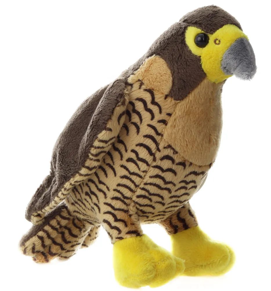Plyšový sokol o velikosti cca 17,5 x 8 x 14 cm.