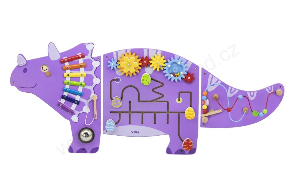 Nástěnná hračka Viga Dinosaurus Triceratops obsahuje 8 zábavných aktivit pro batolata a děti.Je tvořena 3 panely, které se spojují a vytvářejí jednoho velkého fialového dinosaura, který děti zabaví a zaujme na celé hodiny.Každý panel se snadno rozebírá, instaluje a přepravuje.