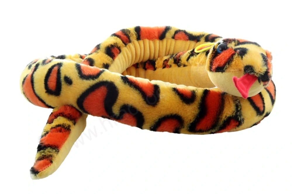 Plyšový had o rozměrech 160x8x5 cm.